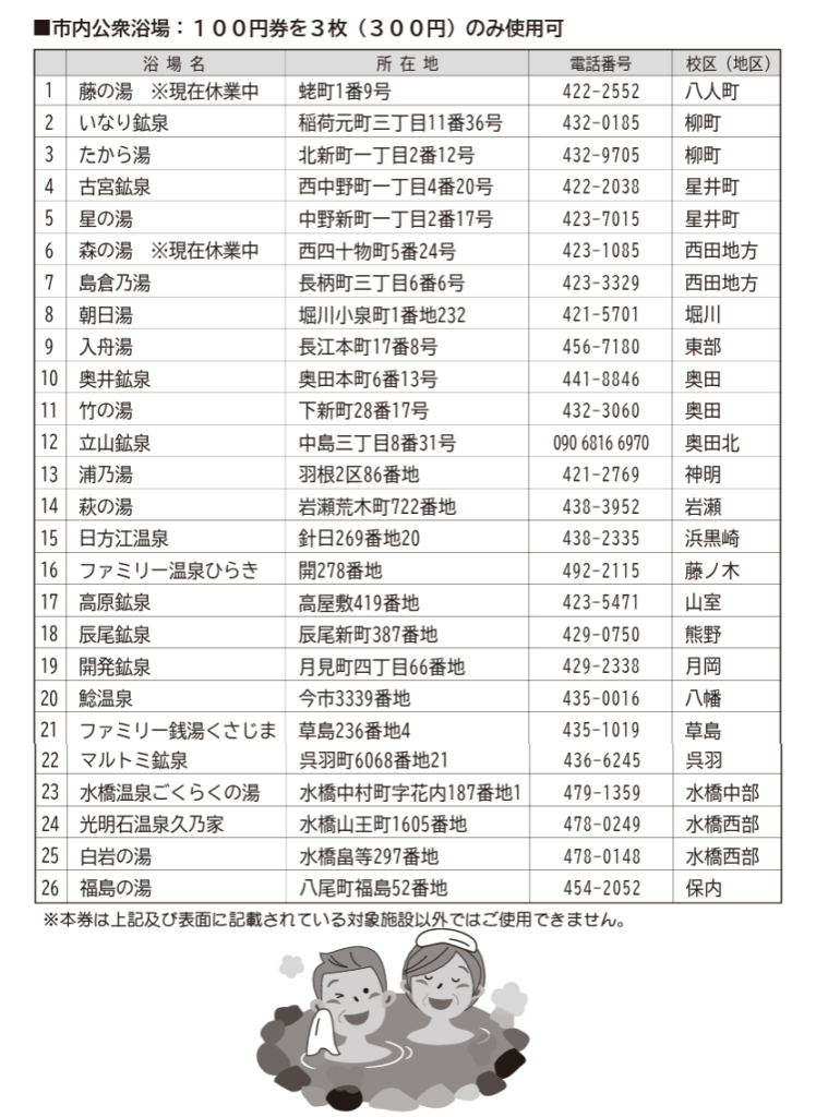 富山市内にお住まいで在宅の満70歳以上の方には、市が利用対象とする公衆浴場等で使用できる「入浴券」を交付しているそうです。